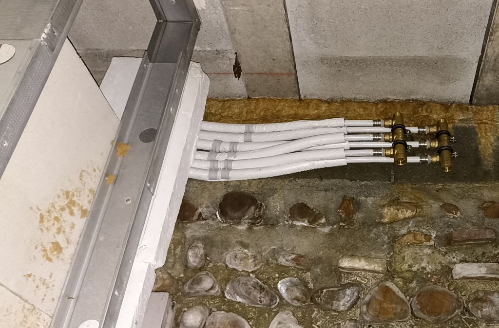 La distribution est faite en tuyaux multicouches isolés et la partie "primaire= sous station" en cuivre.