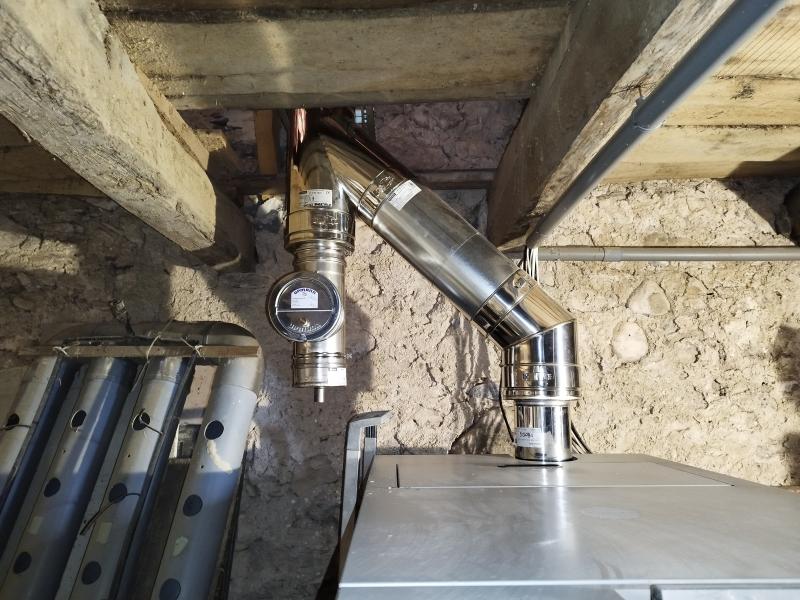 Notre client nous a contactés car il souhaitait transformer sa chaudière à plaquettes pour un fonctionnement aux granulés. Lors de la visite du chantier, nous avons donc bien sûr relevé tous les éléments pour la transformation de sa chaudière vers un fonctionnement à granulés, mais nous avons surtout alerté le client sur la réalisation de son conduit de fumées qui n'était pas aux normes :