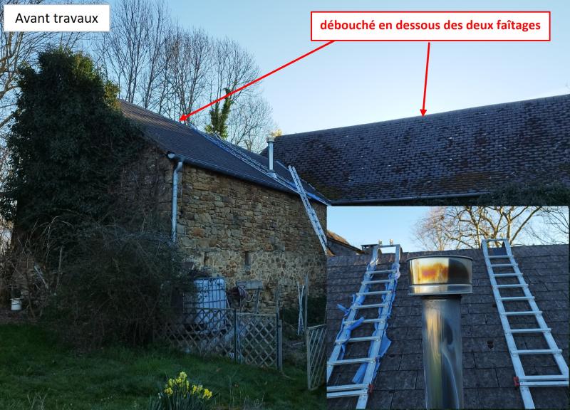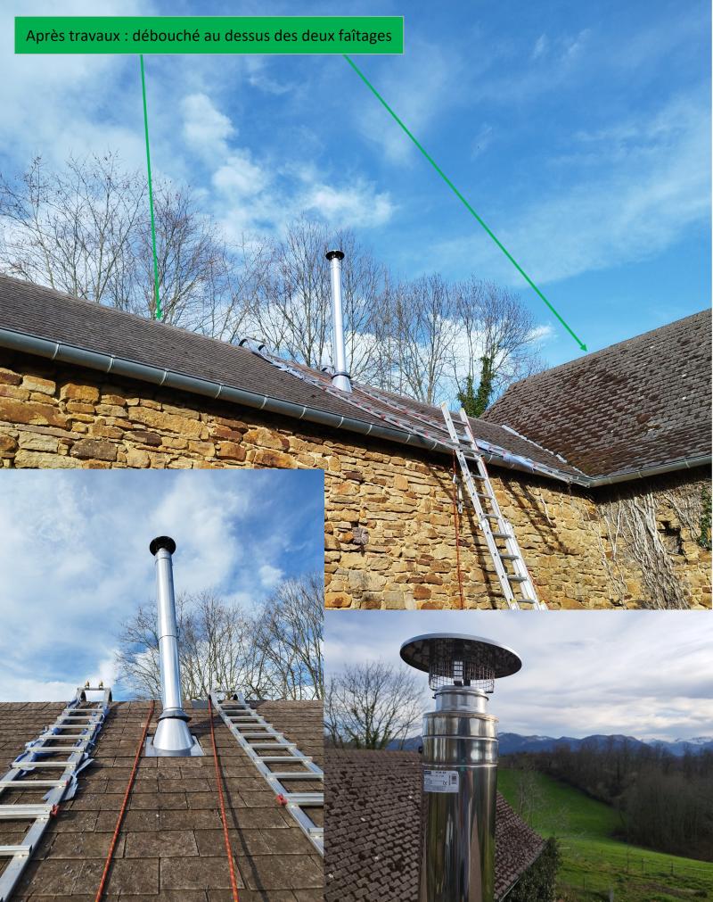 - Conduit de fumées non conforme au DTU : conduit ne dépassant pas le faitage de la toiture sur laquelle il est installé et présence d'un autre bâtiment accolé dont le faitage est plus haut et à moins de 8 m. Le débouché du conduit doit donc dépasser de 40 cm le faitage le plus haut.