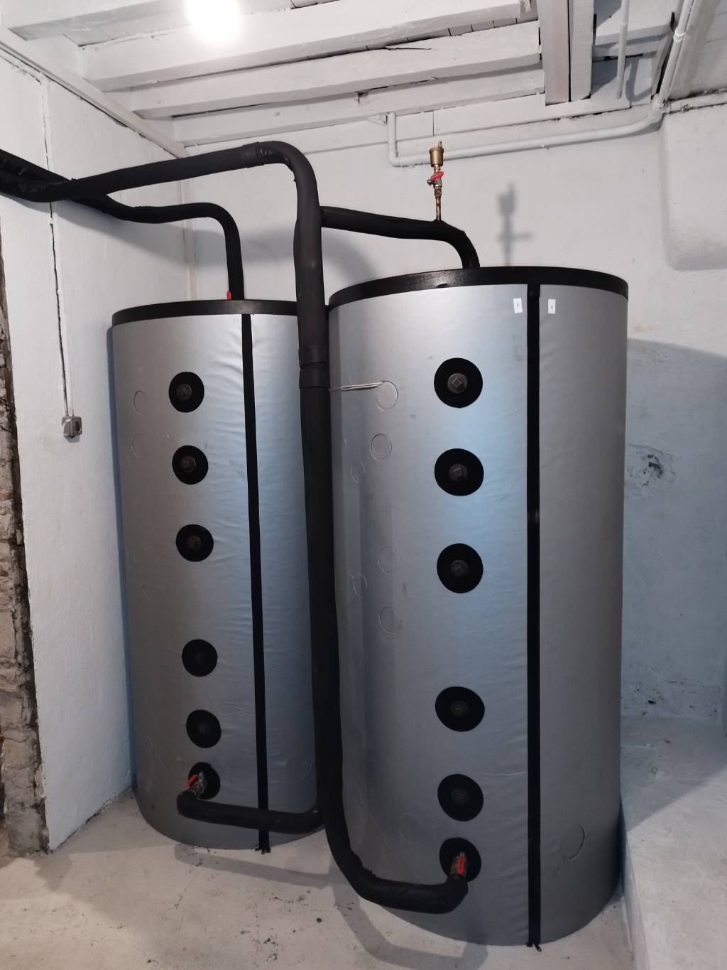 Nous avons donc installé une chaudière bûches FROLING S4 de 22 kW, couplé à deux ballons tampons de 850 litres unitaire (passage de porte et place contraignantes) montés en série, qui alimente le réseau de radiateurs fonte existant. Il a été mis sur cette installation un système de gestion du ballon tampon à 4 sondes de température qui permet, à l'ouverture de porte pour chargement de bois, une indication précise et un niveau visuel sur l'écran de la quantité de bois à charger pour chauffer complètement le ballon tampon, cette fonction de régulation permet notamment d'éviter les surcharges en bois et donc de réduire les réductions/maintien de feu de la chaudière générateur de bistre dans la chaudière et le conduit de fumées et de pollution dans l'atmosphère.