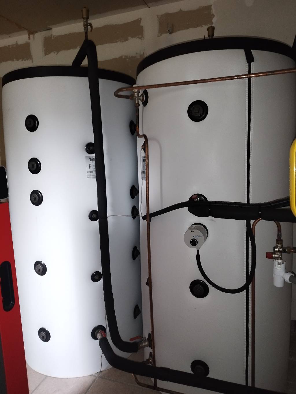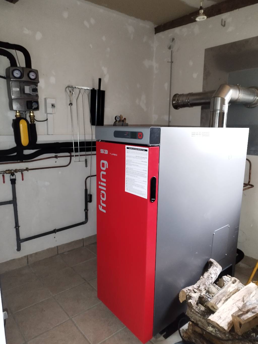 Le local où se situait la chaudière gaz n'étant pas adapté à l'installation d'une chaufferie bois, nous avons proposé d'installer la chaudière dans une pièce inutilisée pour l'instant à 7-8m de l'installation actuelle. Après étude thermique la solution proposée est la combinaison d'une chaudière bûche FROLING S3 de 20 kW avec un foyer de 145 litres et 2 ballons tampons de 1000L en série dont un assurant la production d'eau chaude via un serpentin en inox. Ce qui permet de faire maximum 1,5 charges/jour par -6 °C!!! Et avec un confort maximum avec la régulation climatique couplée à une sonde d'ambiance.