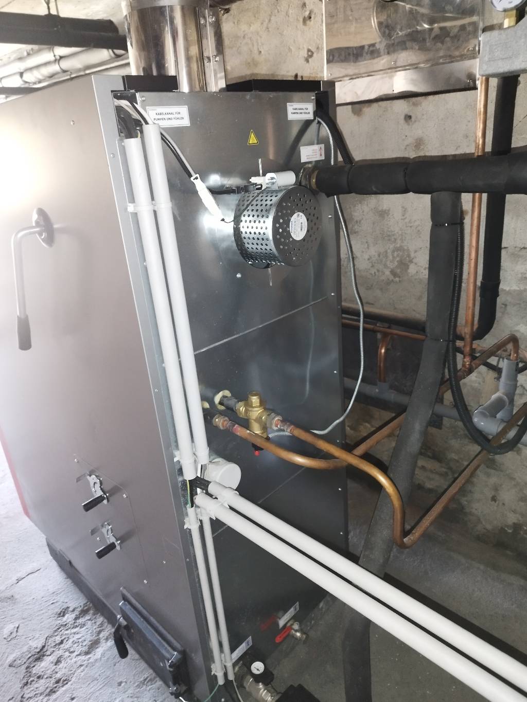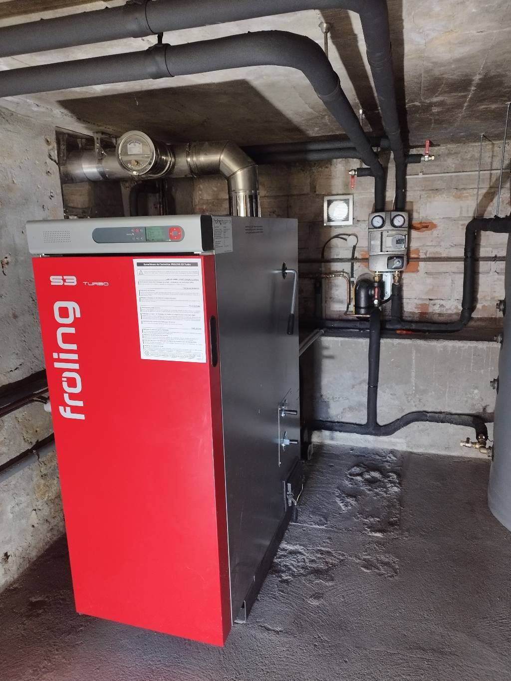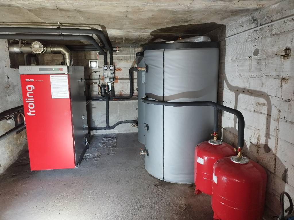 Évidemment le client souhaitait le moins de chargement possible afin de lui laisser le temps libre pour son activité. C'est donc logiquement que nous avons proposé une chaudière bûche de marque Froling modèle S3 Turbo de 20 kW. L'avantage de ce modèle est une capacité de chargement de 145 litres, soit quasiment 40-50 kg de bois (en fonction du taux d'humidité) par charge. D'après nos estimations la fréquence maximale de chargement serait dans ce cas d'une charge et demi par jour par -5°C extérieur, ce qui rend le chauffage bois beaucoup moins contraignant. Cette autonomie est rendue possible par l'installation de deux ballons tampons stratifiés de 800 litres unitaire, soit 1600 litres de stockage au total