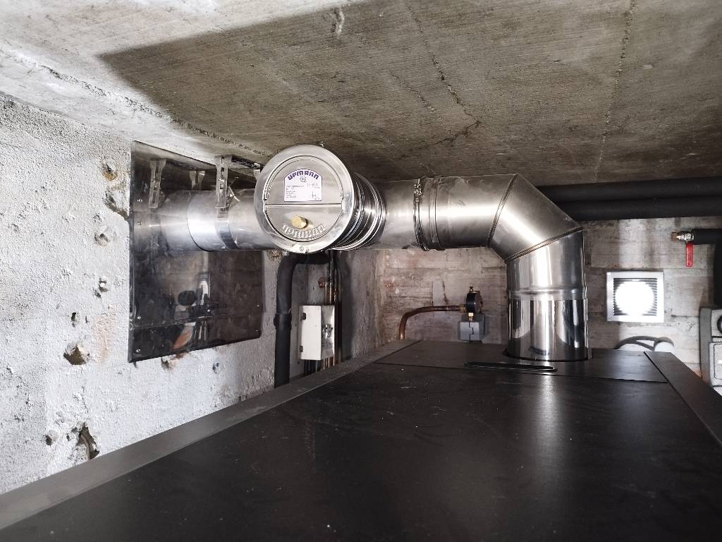 Pour l'évacuation des fumées, nous avons choisi de conserver le conduit maçonné existant avec remplacement du tubage adapté au bois et raccordement