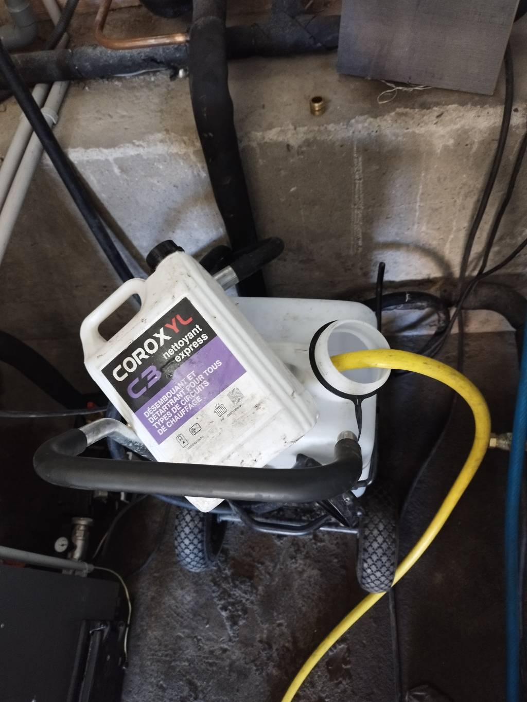 Un désembouant express de chez Coroxyl a ensuite été injecté pour décoller les boues présentes dans les radiateurs et le réseau.