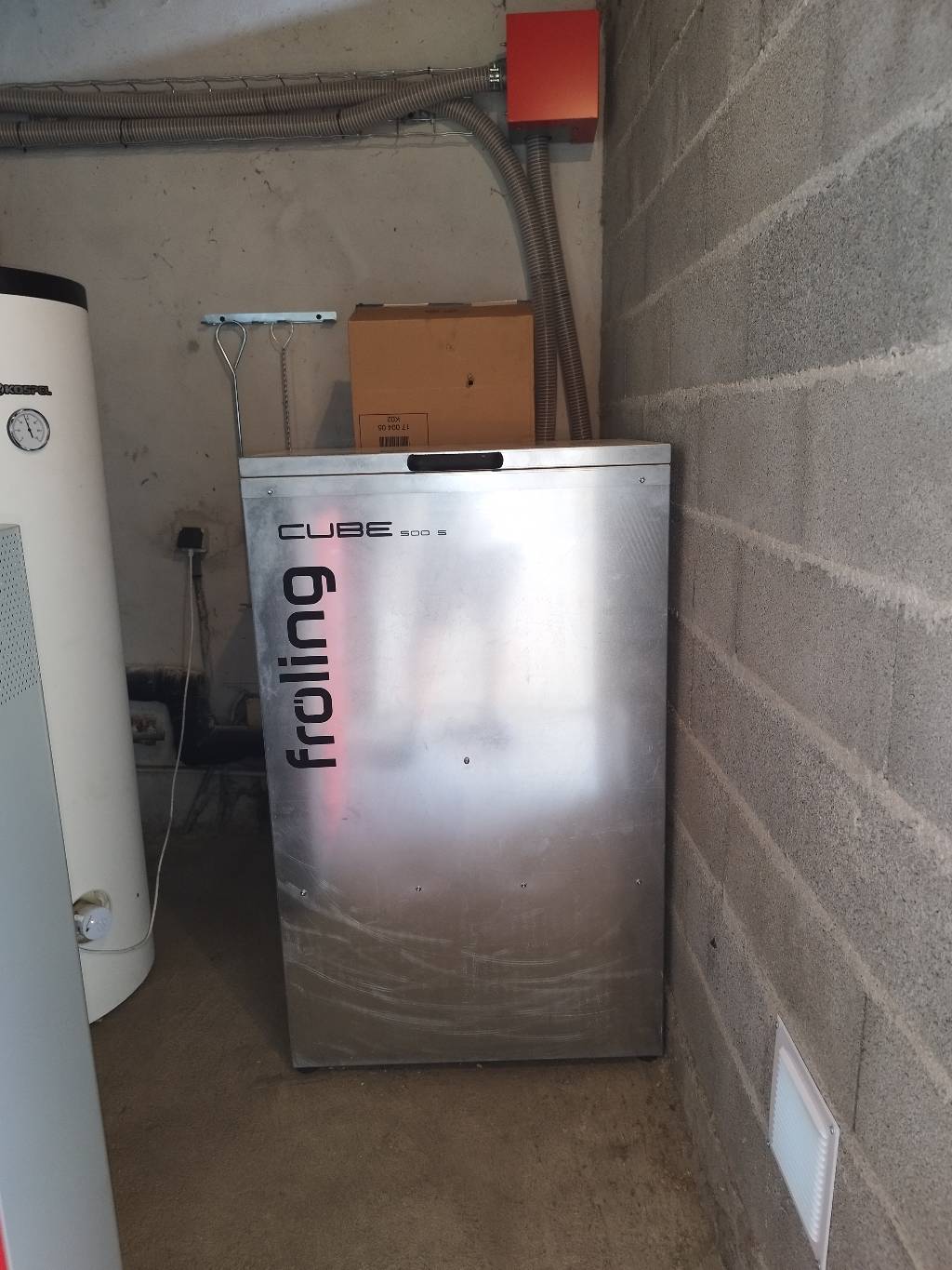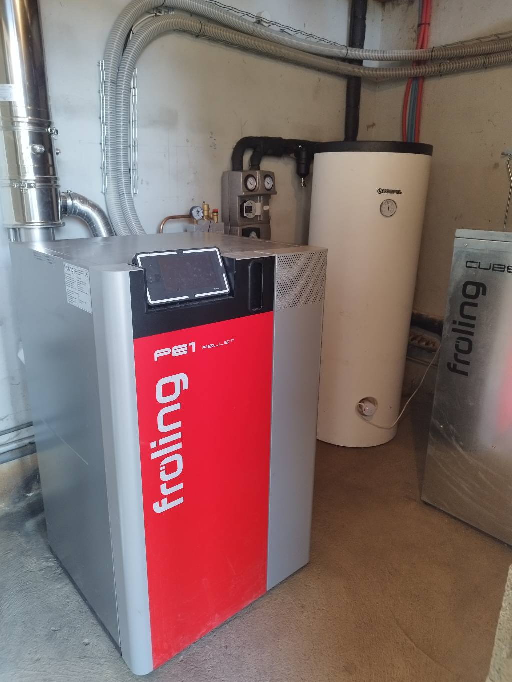Suite à la visite technique, et afin de tout implanter dans la chaufferie actuelle, nous avons proposé une chaudière granulés Froling modèle PE1 de 20 kW, couplée à un préparateur d'eau chaude de 200 litres et un silo à granulés à chargement manuel de 500 kgs de capacité.