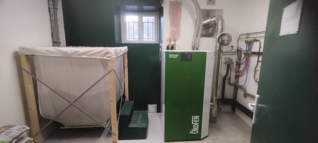 Nous avons proposé et installé une chaudière granulés de marque Okofen, modèle Pellematic Compact de 18 kW, alimenté par un silo à chargement manuel par sacs de 650 kg de capacité, permettant d'avoir une autonomie de 2 à 4 semaines.