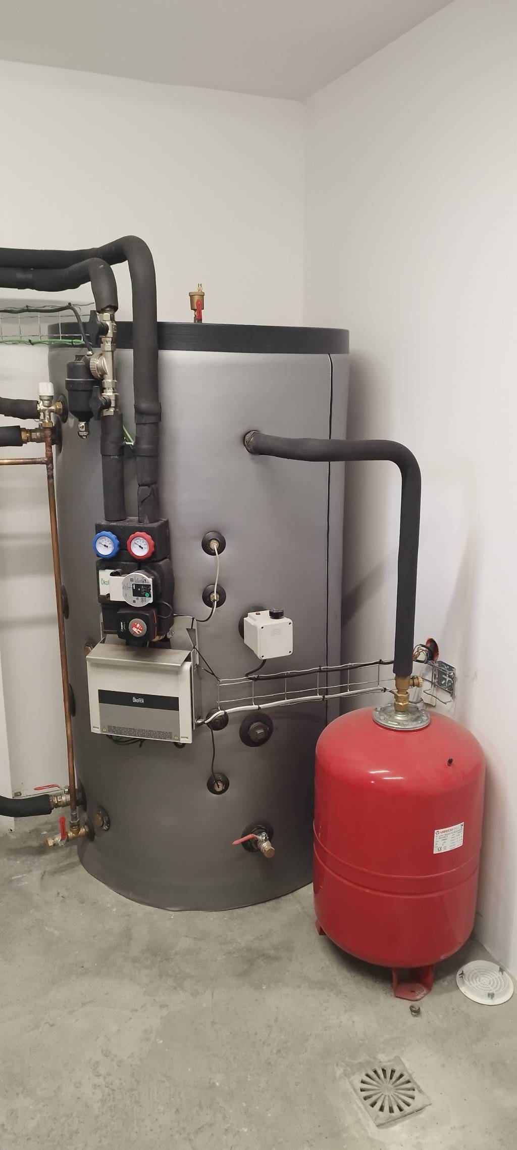 La chaudière est couplée à un ballon tampon de 600 litres, permettant d'assurer des cycles de fonctionnement longs et optimaux à la chaudière. Le ballon assure également la production d'eau chaude via un serpentin inox permettant des débit importants.