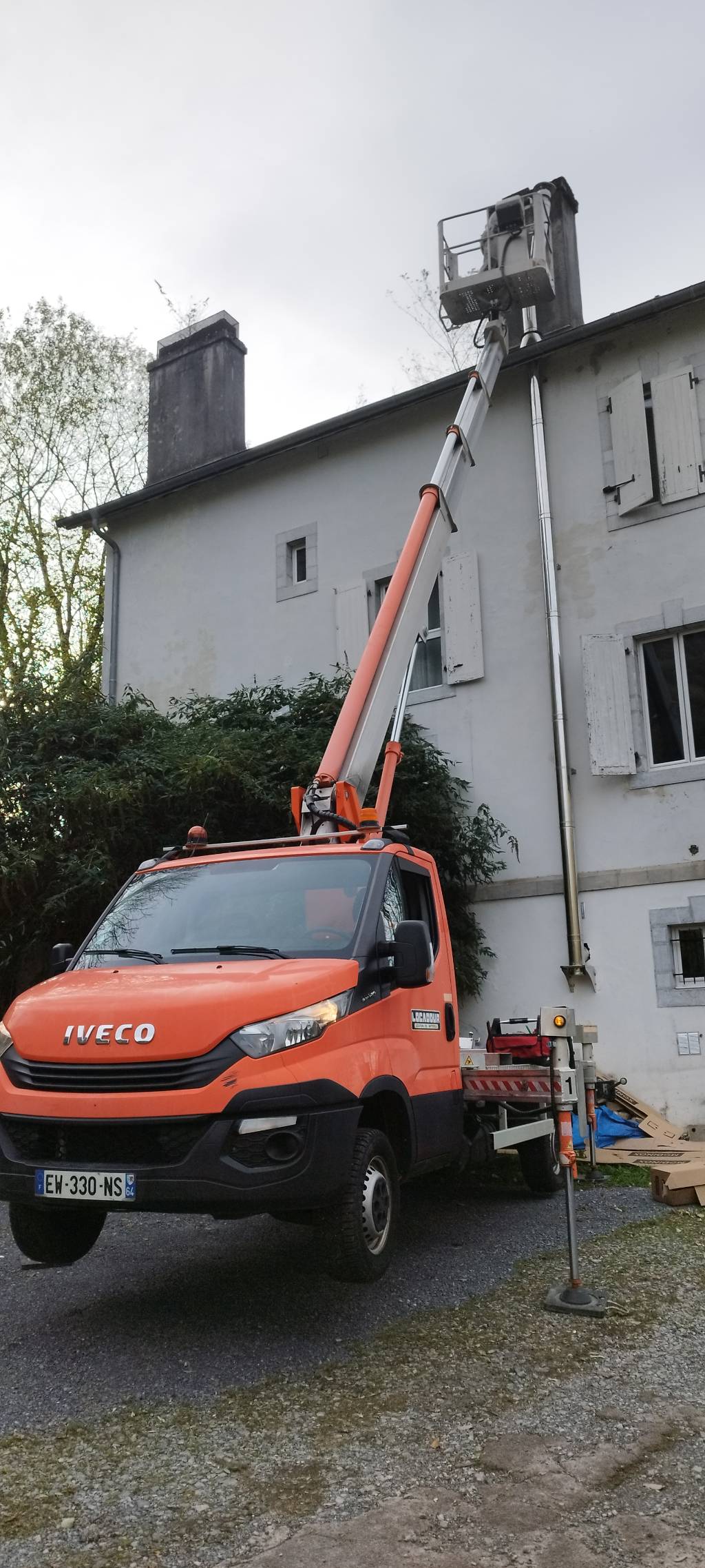 Après quelques surprises lors de l'enlèvement du conduit de l'ancienne chaudière, nous avons finalement créé un conduit de fumée isolé extérieur de 13m de haut le long du pignon de la maison, nécessitant une nacelle, seule possibilité pour garantir le respect de la règlementation